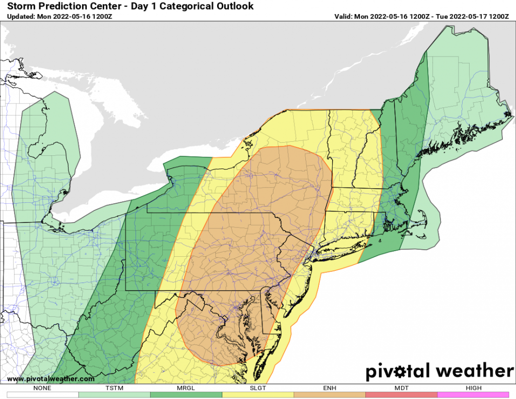 An ENHANCED RISK of severe thunderstorms with strong damaging winds the biggest threat, will exist from central and eastern NY this afternoon and evening, south into eastern Pennsylvania, New Jersey, Maryland, Delaware and northern Virginia. Late afternoon and evening these storms will hit the NYC area and head east through western New England. The threat for hail and tornadoes is not zero, it’s still there, but this will not be a major “tornado” threat for the northeast. I’ve seen a lot worse tornado threats there and this is not one of them. Strong straight line winds and microbursts will be the greatest danger here.