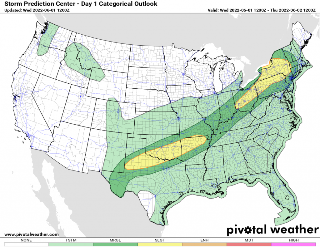 Showers and thunderstorms, some of which could be severe, will be sprawled out over the nation from New England and Upstate NY, into the Ohio and Mississippi Valleys, and into the southern Plains, as far south as Texas. Heavy rains, frequent lightning and damaging wind gusts are possible with these storms. This front will sink south and eventually stall out late this week across the Southeast and the lower Mississippi Valley, as the upper air wind flow over the US goes almost perfectly “zonal” or west to east. No big ridges. No big troughs. It’s been awhile since we’ve seen this! It means over the northern US over the next several days, at or below normal temps (which for June should be comfortable) and at or above average temps across the southern US (which for June means hot and humid).